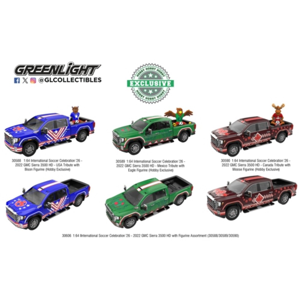 GL30606 - 1/64 INTERNATIONAL SOCCER CELEBRATION 26 - 2022 GMC SIERRA 2500 HD WITH FIGURINE ASSORTMENT (30588/30589/30590)