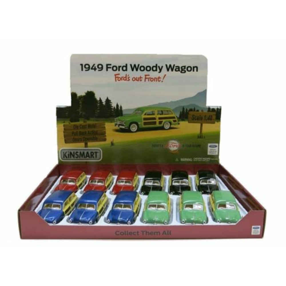 KT5402D-12 - 1/36 1949 FORD WOODY WAGON. ASSORTMENT TRAY OF 12 WITH 4 COLOURS IN THE TRAY (GREEN RED BLUE BLACK)