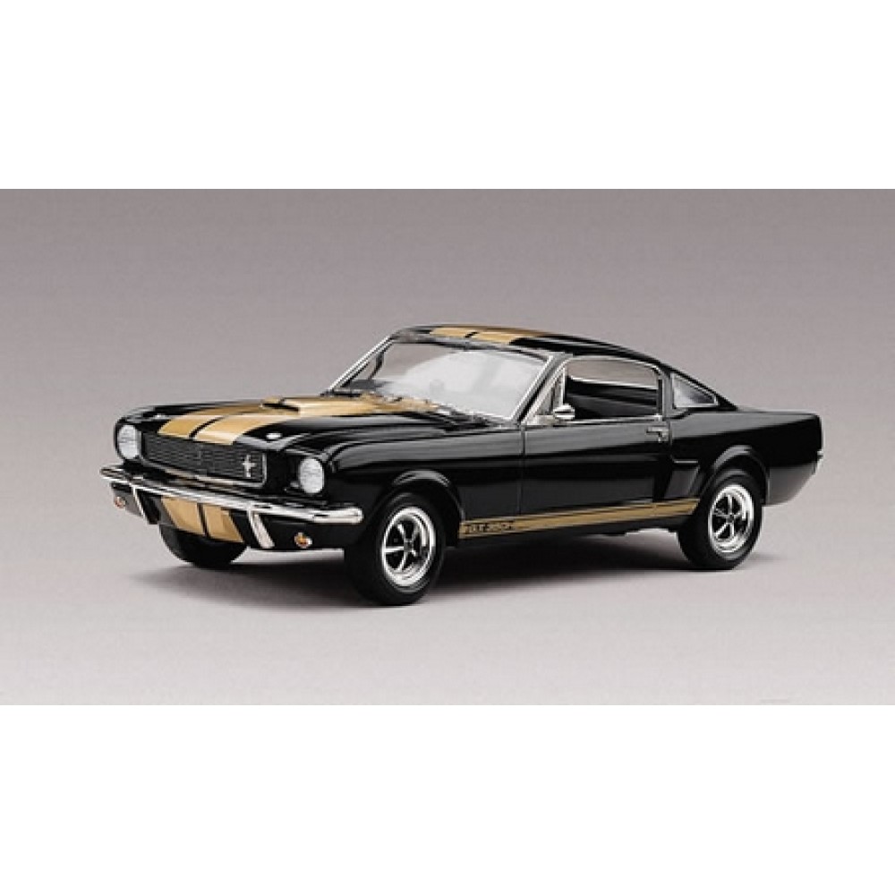 GT instrument cluster, dual exhausts and 4-speed transmission. Highly detailed 289 cid engine. Exclusive Hertz "Gold" waterslide decal stripes. Molded in white and clear, with plated parts and black vinyl tires. Requires paint and glue (not included).